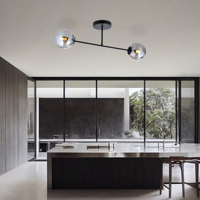 Czarna lampa na sufit do eleganckiego pokoju, kuchni, jadalni, czy przedpokoju, takie jest nasze Mili. Prezentuje nowoczesny, nieco "kosmiczny" design z dwoma punktami światła. Ta lampa na sufit, ma grafitowe szklane kule o średnicy 14 cm. Klosze są wykonane ze szkła ręcznie robionego. Oryginalna, prosta forma lampy sprawia, że pasuje ona do wielu wnętrz i dodaje im wyjątkowego charakteru. Pokoje, jadalnie, sypialnia, garderoby i przedpokoje urządzone w stylu modern i nowoczesnym, to miejsce gdzie nasza oprawa będzie się czuła najlepiej.