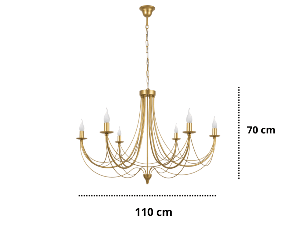 Lampa wisząca Jovesa to jedna z naszych propozycji wśród żyrandoli świecznikowych. Żyrandol klasyczny, 6-ramienny, nasz bestseller oświetlenia. Rozpiętość ramion tej lampy to aż 110 cm, a jej wysokość możemy zmienić dodając dowolna ilość oczek łańcucha. Żyrandol w standardzie ma 270 cm wysokości i można go samodzielnie skrócić do ok 80 cm. odejmując ogniwka łańcucha podczas montażu. Wszystkie zmiany długości łańcucha można umieścić w rubryce " uwagi" podczas zakupu, zgłosić je mailowo lub telefonicznie 536 762 776. Jovesa na 6 żarówek typu płomyk to piękne i okazałe źródło światła, oraz elegancka ozdoba salonu i pomieszczeń reprezentacyjnych, polecana do dużych i wysokich domów, oraz hoteli.