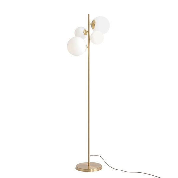 Nowoczesna lampa podłogowa Molo z czterema kloszami w kształcie kul to bardzo designerska w formie propozycja lampy stojącej. Podstawa lampy podłogowej jest wykonana z mosiądzu, a klosze są w kolorze mlecznobiałym. Lampa stojąca Molo idealnie będzie pasowała do nowoczesnych salonów, gdzie zapewni dodatkowe przytulne światło. Lampa stojąca jest również elementem dekoracyjnym w pomieszczeniu, dodaje wnętrzu uroku i unikalnego stylu. Molo ma prostą formę oraz uniwersalną kolorystykę, która pasuje do wielu aranżacji wnętrz. Rozmieszczone wokół osi lampy kule precyzyjnie rozświetlają pomieszczenie i są jego dekoracją.