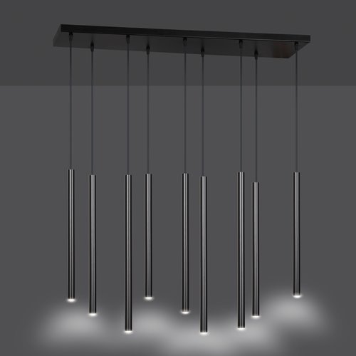 Podłużna lampa sopel Siter to oświetlenie wiszące z 9 rureczkami ledowymi w kolorze czarnym. Jedna rureczka to jeden punkt światła spot. Wiszący spot wyposażony jest w regulację wysokości. Designerska a zarazem minimalistyczna forma oświetlenia spot sprawdzi się w każdym pomieszczeniu i w różnych stylach wnętrz. Lampa sopel Siter wspaniale prezentuje się w nowoczesnym salonie, a także w pomieszczeniach publicznych - designerskich biurach i kawiarniach. Lampy sople dają skoncentrowane światło, dlatego często służą jako oświetlenie w jadalni lub kuchni nad wyspą kuchenną.
