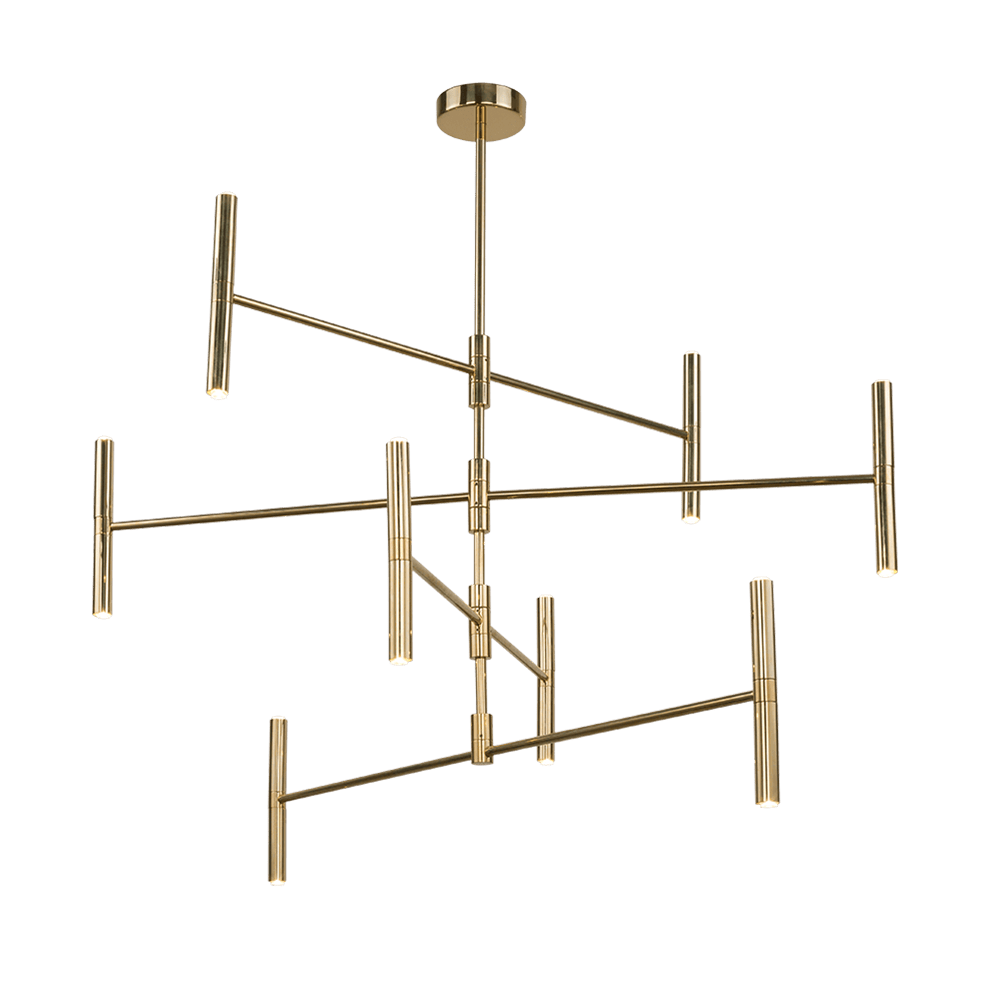LOWI to elegancki żyrandol do salonu wykonany z polerowanego mosiądzu. Forma złotego żyrandola jest nowoczesna i funkcjonalna. Stelaż żyrandola zbudowany jest z czterech prostych ramion, umieszczonych kaskadowo. Poziome ramiona są ruchome, co pozwala na modelowanie kształtu żyrandola i grupowanie światła. Punkty świetlne znajdują się po obu stronach pionowych rurek, wieńczących ramiona - to tam umieszczone są świecące ledy. Żyrandol świeci w górę i w dół. Prosta i efektowna forma złotego żyrandola ledowego sprawia, że jest to bardzo lampa ozdobna, a jednocześnie praktyczna i przyjemna w użytkowaniu.