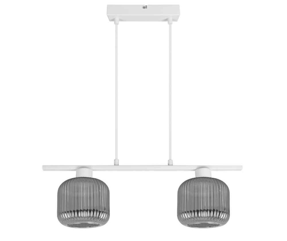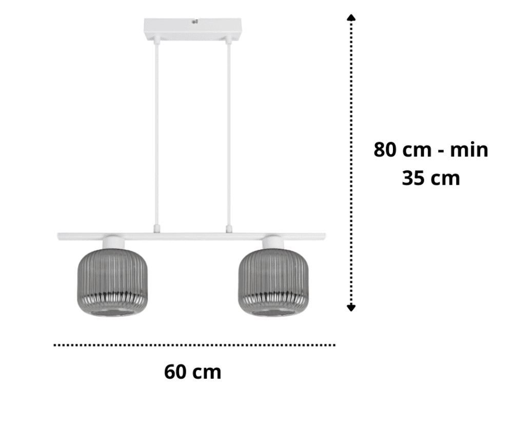 Nowoczesna lampa wisząca z dwoma kloszami LIKO to piękne i funkcjonalne oświetlenie do nowoczesnych pomieszczeń. Jest to doskonała lampa do kuchni lub nowoczesny żyrandol do pokoju młodzieżowego. Liko to lampa z dwoma punktami światła, które osłonięte są wyrazistymi grafitowymi kloszami z ryflowaną strukturą. Zamontowanie kloszy w lampie niesie wiele korzyści. Szklane osłonki - klosze, miękko rozpraszają światło, dzięki czemu blask żarówek nie razi oczu. Długość lampy Lampa LIKO wynosi 80 cm. Stelaż lampy jest zawieszony na przewodach, które można skrócić we własnym zakresie. Sposób mocowania lampy do sufitu daje możliwość dopasowania oświetlenia do wysokości pomieszczenia.