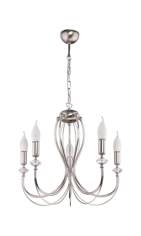 Żyrandol świecznikowy, elegancki Melodi to nasza propozycja lampy klasycznej do pokoju lub jadalni. Oprawa oświetleniowa ma pięć ramionek i jest niklowana na kolor srebrny. Lampa w całości jest wyprodukowana w Polsce. Melodi posiada ponadczasową formę, która doskonale dopasuje się do wielu aranżacji wnętrz - od nowoczesnych, do bardziej klasycznych i tradycyjnych. Dodatkowo ozdabiają ją bezbarwne kryształki znajdujące się na rurce pod żarówkami.