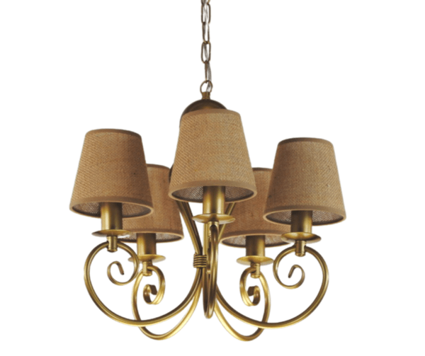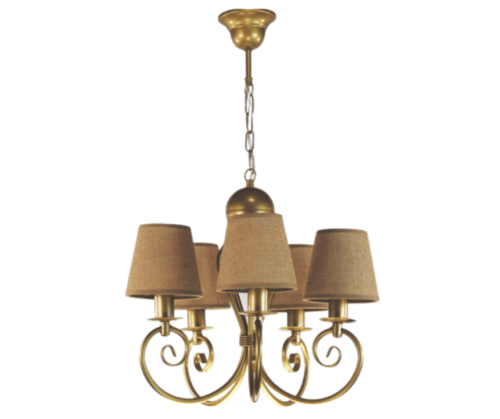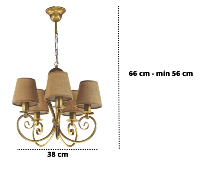 Żyrandol pięcioramienny Klinos to nasza TOP lampa. Jest ona kupowana często ze względu na swój ponadczasowy design, który nigdy nie wychodzi z mody. Polecamy ją do niewielkich salonów i pokoi urządzonych w sposób tradycyjny i klasyczny. Złoty stelaż i abażurki o kolorze naturalnym-juta sprawiają że pasuje do pokoi, kuchni i małych salonów gdzie dodatki są w stylu naturalnym i eco. Lampa też doskonale będzie się prezentować w pokojach gdzie dominują elementy z drewna. Oprawę można również skrócić o ok. 10 cm, odejmując trzy ogniwka łańcucha.