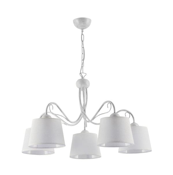 Żyrandol z abażurami Kamel, to pięć ładnie wygiętych ramionek, delikatnie ozdobione drucikami. Cała oprawa oświetleniowa pomalowana jest na kolor biało - srebrny, a i abażurki są też w podobnym odcieniu. Lampa wpisuje się w modny wystrój wnętrz w stylu prowansalskim, vintage i rustykalnym, gdzie doskonale komponuje się z ciepłymi i naturalnymi barwami. Ta wysokiej jakości kompozycja jest produkowana w sposób staranny w polskiej firmie.