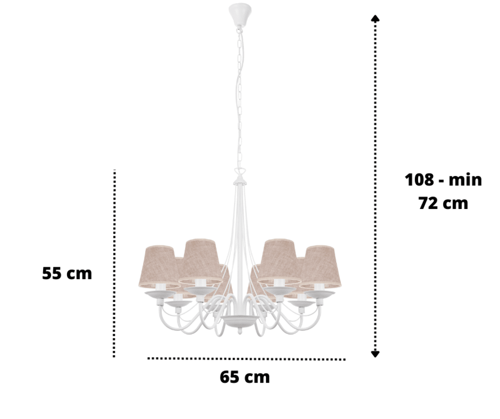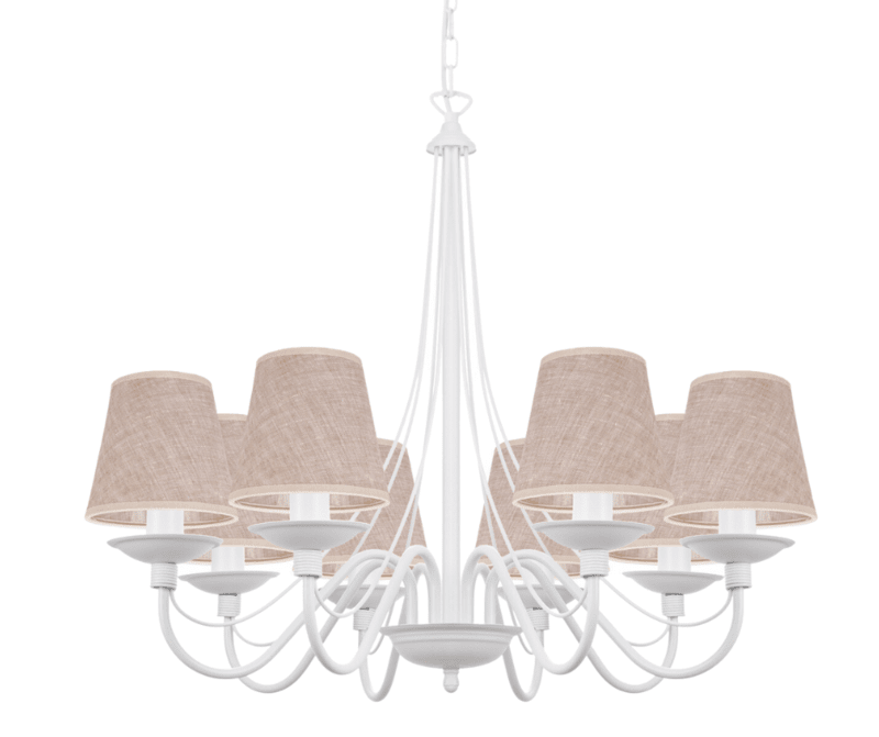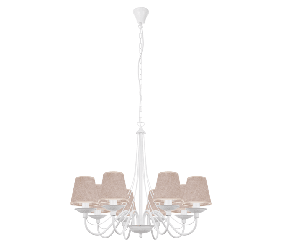 Żyrandol biały z abażurami w kolorze naturalnego lnu, duży Santa, to propozycja dość dużej oprawy oświetleniowej w stylu klasycznym. Lampa posiada osiem ramion delikatnie ozdobionych drucikami i jest pomalowana na kolor biały. Santa to żyrandol który swoją formą i kolorystyką sprawia, że jest najczęstszym "gościem" w klasycznych i tradycyjnych salonach, pokojach i sypialniach. Swoim designem będzie też dobrze prezentował się w pomieszczeniach w stylu prowansalskim i shabby chic. Białe abażurki dodają tej białej lampie wiszącej elegancji, szyku i powodują że światło żarówki nie drażni naszych oczu. Biały żyrandol Satna ma wysokość 108 cm i można go samodzielnie skrócić, po odjęciu pożądanej ilości ogniwek łańcucha do 72 cm. Lampę można też wydłużyć, ale to wymaga ustaleń telefonicznych lub mailowych.