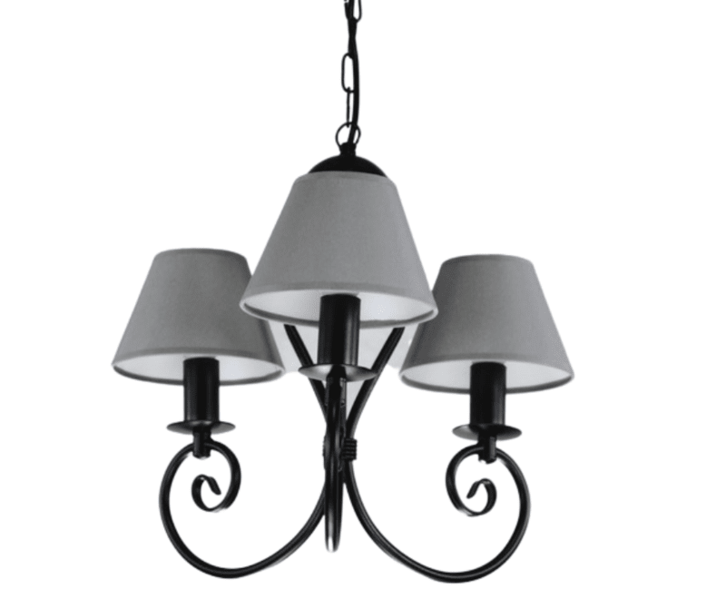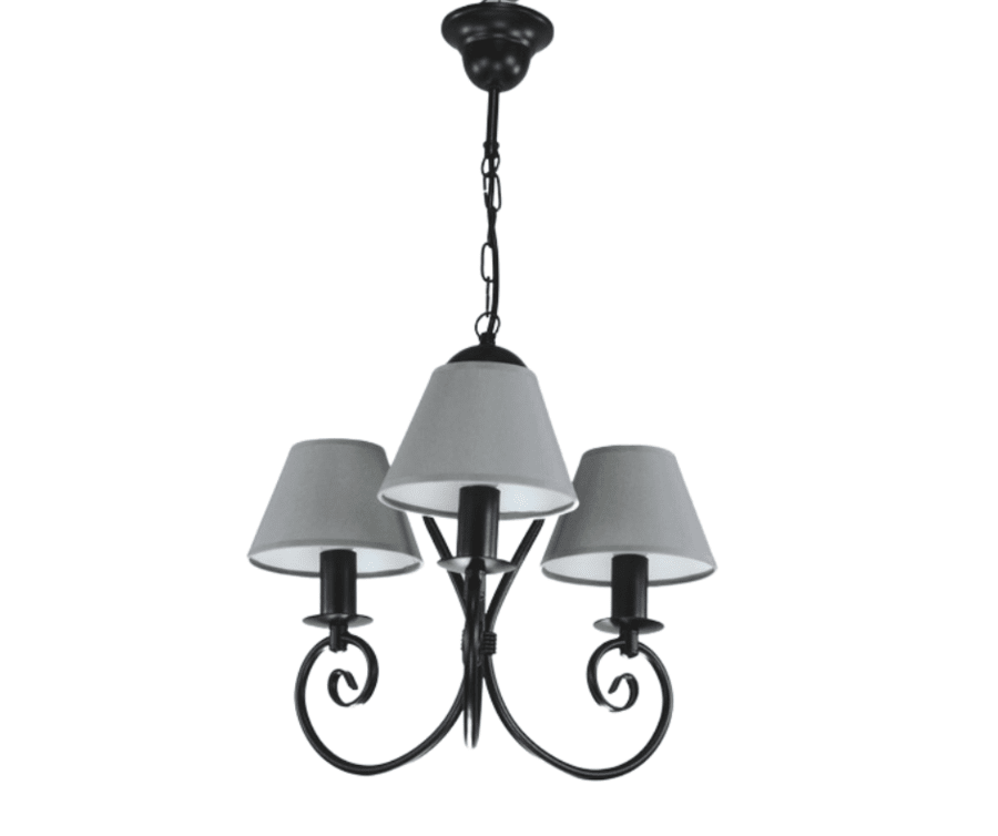 Żyrandol z abażurkami Klinos to czarny żyrandol klasyczny, którego ozdobą są trzy subtelnie i elegancko wygięte ramiona i eleganckie abażury, okrywające punkty światła. Lampa wisząca utrzymana jest w ciekawej kolorystyce. Matowa czerń stelaża podkreślona jest przez elegancką szarość abażurów. Abażury wykonane są z szarej tkaniny, od spodu podklejonej specjalną pleksą. Dzięki abażurom światło lampy jest przyjemnie stłumione i nie razi oczu. Żyrandol z 3 abażurami ma 66 cm długości. Lampę wiszącą można skrócić o około 10cm, odejmując 3 oczka łańcucha. Czarny żyrandol z serii Klinos rozświetla głównie małe sypialnie, saloniki i pokoje, w których dominują jasne kolory i detale w odcieniach szarości. Jest to piękna lampa do niewysokiego pokoju, oprawa sprawdzi się również jako żyrandol do małej sypialni.