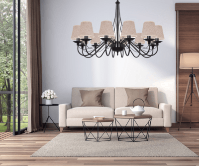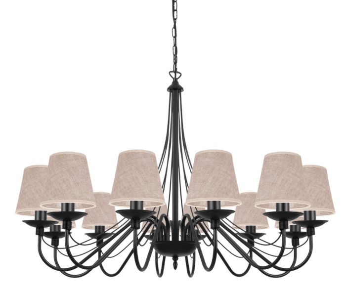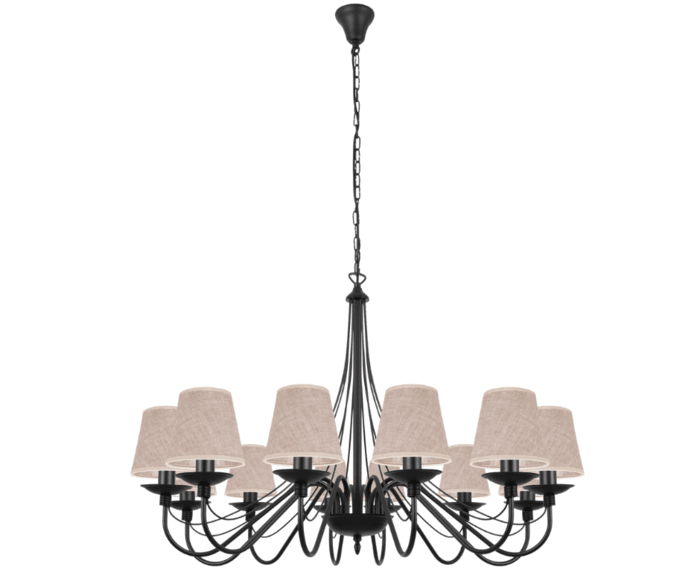 Jeżeli chcecie postawić na coś wyjątkowego, to klasyczny, efektowny duży żyrandol z abażurami w kolorze czarnego matu będzie idealnym wyborem. Kupując lampę wiszącą, stawiasz na ponadczasowy kształt i formę oświetlenia oraz otrzymujesz gwarancję jakości. Okazały, elegancki i stylowy żyrandol o dużych rozmiarach, to znakomity pomysł na oświetlenie i ozdobę salonu. Lampa ma 85 cm średnicy, a jej całkowitą długość możemy zmienić, dodając odpowiednią ilość ogniwek łańcucha. Santa jest częstym "gościem" w wysokich salonach, salach i pomieszczeniach gastronomicznych. W tym dużym żyrandolu wiszącym abażury w kolorze naturalnego lnu są w odpowiednich i proporcjonalnych wymiarach, a dzięki nim światło żarówki równomiernie rozprasza się, nie rażąc oczu. Lampa ta bardzo często wieszana jest w pomieszczeniach o stylu tradycyjnym, prowansalskim i klasycznym, ale doskonale też zaprezentuje się w nowoczesnych salonach, bo jej ponadczasowość i dobry styl jest oczywista.