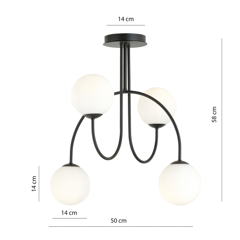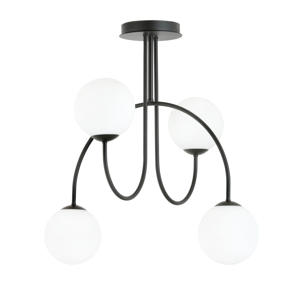 Czarny i nowoczesny żyrandol Aria to prosty i oryginalny stelaż. Prezentuje nowoczesny design z 4 punktami światła. Ta lampa na sufit do pokoju, ma mlecznobiałe szklane kule o średnicy 14 cm. Oryginalna, dynamiczna forma lampy sprawia, że pasuje ona do wielu wnętrz i dodaje im wyjątkowego charakteru. Salony, pokoje i jadalnie urządzone w stylu modern i nowoczesnym, to miejsce gdzie nasza Aria będzie się czuła najlepiej.