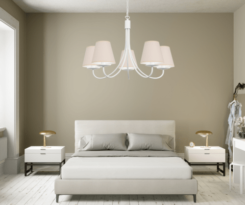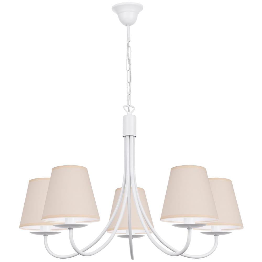 Żyrandol klasyczny Kama pięcioramienny w kolorze białym z abażurkami ecru, to bardzo ładna i ponadczasowa propozycja oprawy oświetleniowej. Jego forma i kształt sprawiają, że od lat cieszy się dużym zainteresowaniem kupujących. Proporcjonalne i ładne abażurki równomiernie rozpraszają światło żarówki. Świetnie sprawdzi się jako oświetlenie salonu i pokoju, ale również można go powiesić w jadalni i kuchni. Doskonale wkomponuje się w mieszkania o stylu klasycznym, tradycyjnym i retro. Lampę można samemu skrócić o 3 ogniwka łańcucha, obniżając jej wysokość o 10 cm. Cała lampa wraz z abażurkami powstaje w naszej firmie.
