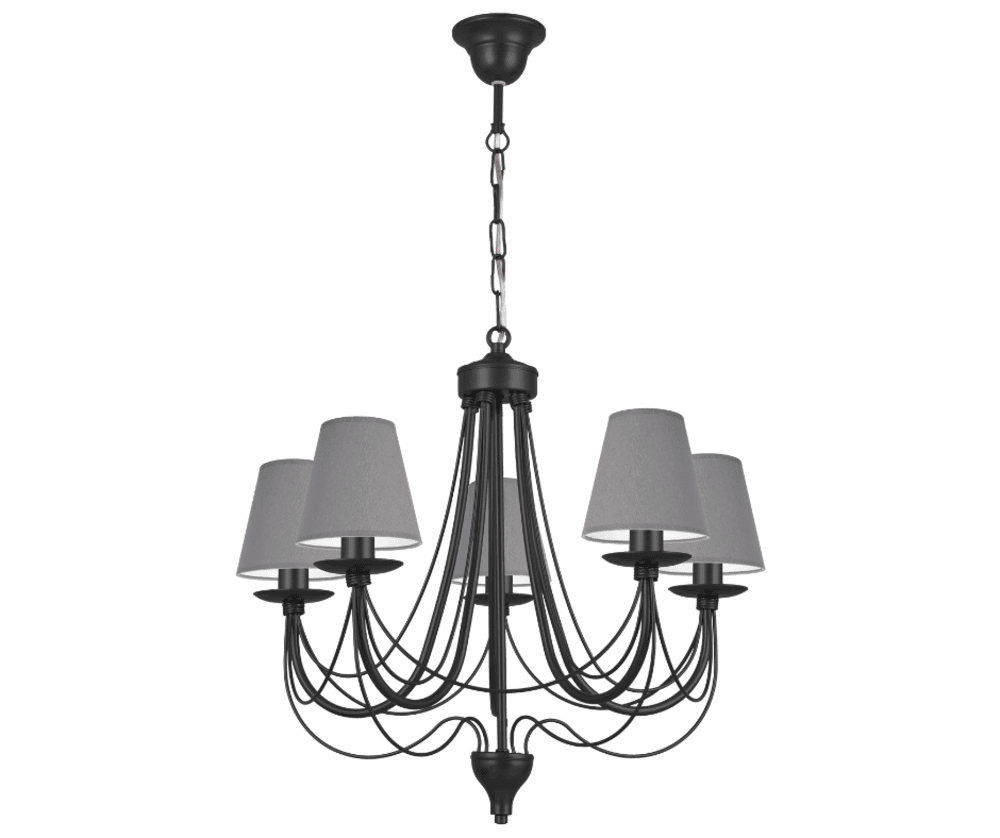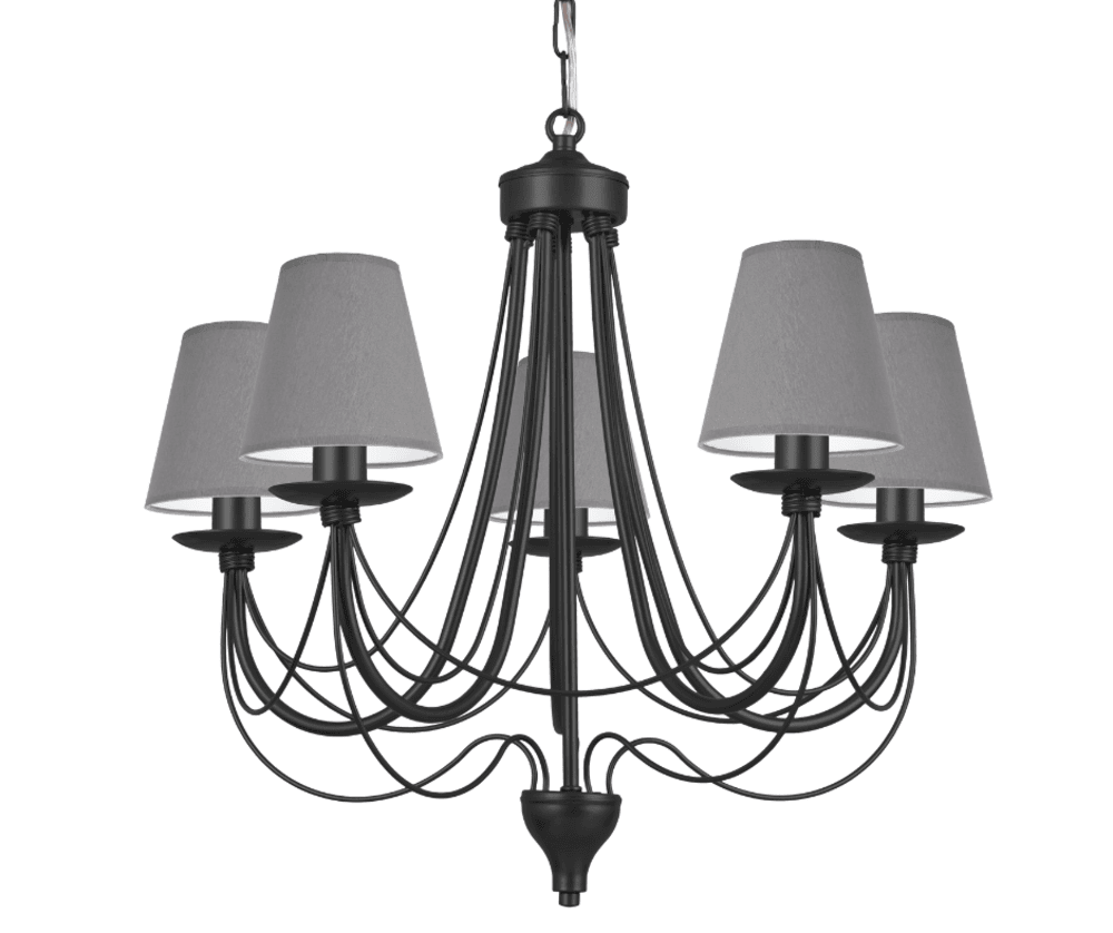 Żyrandol świecznikowy Aura pięcioramienny, czarna lampa na żarówki typu "płomyk" lub żyrandol z abażurami. Propozycja klasycznego oświetlenia do salonu, pokoju, żyrandol do sypialni i jadalni.