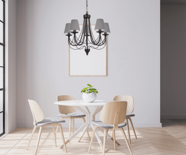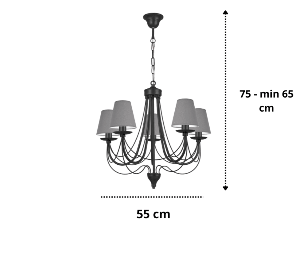 Stylowy żyrandol wiszący sufitowy to dekoracyjna lampa z szarymi abażurami, która stworzy przytulny klimat w pomieszczeniu. Materiałowe abażury osłaniają żarówkę i delikatnie tłumią światło, budując atmosferę przytulności i intymności. Czarny stelaż pięknej lampy jest elementem graficznym na tle jasnych ścian i okien. Do żyrandola Aura można dobrać kinkiety świecznikowe lub kinkiety abażurami Agaron. Elegancki żyrandol do pokoju zachwyca zgrabnym i finezyjnym kształtem stelaża. Ramiona lampy są ozdobione delikatnymi drucikami. Żyrandol jest dostępny także jako lampa na 3 żarówki, powiększona wersja żyrandola wiszącego to duży żyrandol do salonu 12-ramienny Jovesa.