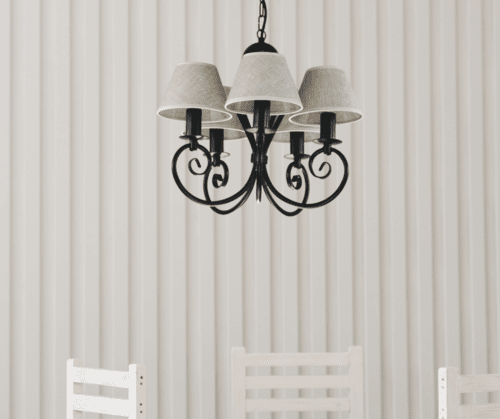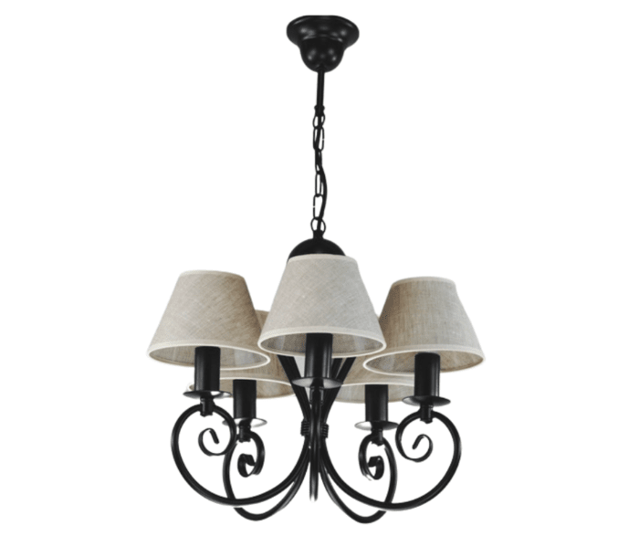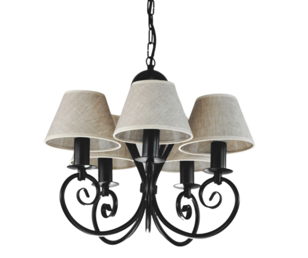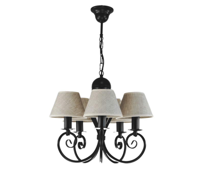 Klasyczny żyrandol pięcioramienny Klinos to nasza TOP lampa. O powodzeniu tego modelu żyrandola decyduje jego ponadczasowy design - klasyczny, zgrabny kształt, który nigdy nie wychodzi z mody. Jest to piękna i praktyczna lampa do pokoju. Polecamy ją do niewielkich salonów i pokoi urządzonych w sposób tradycyjny i klasyczny. Czarny stelaż i abażurki w kolorze lnu sprawiają, że stylowy żyrandol pasuje do pokoi, kuchni i małych salonów, urządzonych w stylu naturalnym i eco. Lampa doskonale będzie się prezentować w pokojach, gdzie dominują dodatki z drewna. Kolorystyka całej oprawy to barwy naturalne i neutralne. Żyrandol można skrócić o ok. 10 cm, odejmując trzy ogniwka łańcucha.