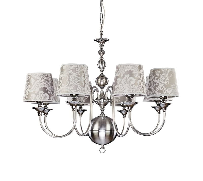 Klasyczny chromowany żyrandol Badumi to lampa zachwycająca swoim kształtem i stylem. Jest to ośmioramienny, rozłożysty żyrandol z ośmioma punktami światła, osłoniętymi eleganckimi abażurkami w tonacji modnej szarości. To połączenie surowości metalowego stelaża i miękkiej struktury materiałowych abażurków nadaje tej lampie wyjątkowego charakteru, który powoduje, że doskonale wpisze się ona w wystrój klasycznych, eleganckich wnętrz jak i tych bardziej nowoczesnych czy glamour.