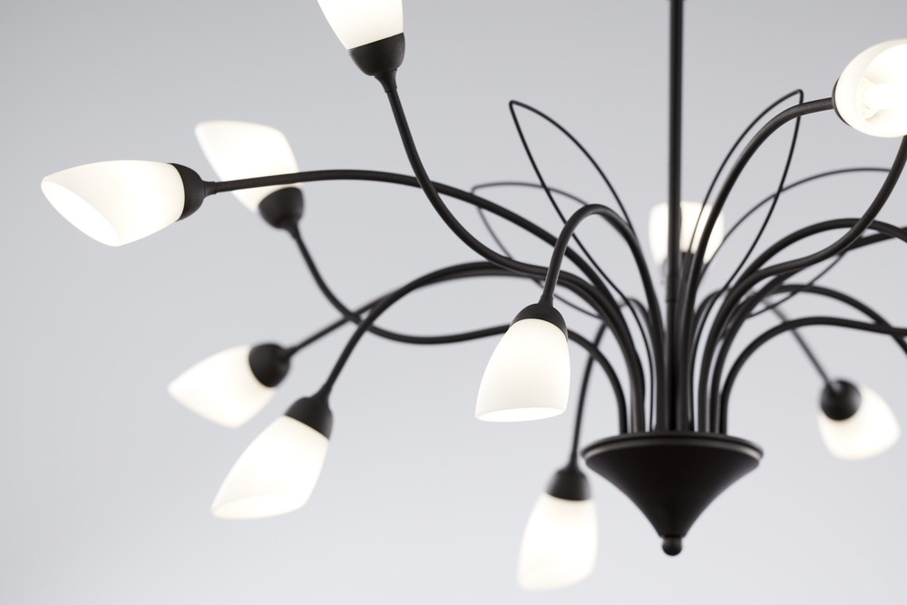 Lampa wisząca Gloria to oświetlenie o unikalnej formie - lampa bardzo przypomina kwiat w rozkwicie. Jej smukłe, wygięte ramiona wyglądają jak delikatne łodygi, a mleczne klosze na końcach przypominają pąki tulipanów lub magnolii. Całość sprawia wrażenie lekkiej, organicznej formy dekoracji. To właśnie miękkość linii stelaża, czyli rozchodzące się na boki ramiona żyrandola, nadają mu naturalny, kwiatowy charakter. Żyrandol Gloria nie jest modelem surowym, geometrycznym — to raczej subtelna, dekoracyjna lampa kwiat inspirowana naturą.