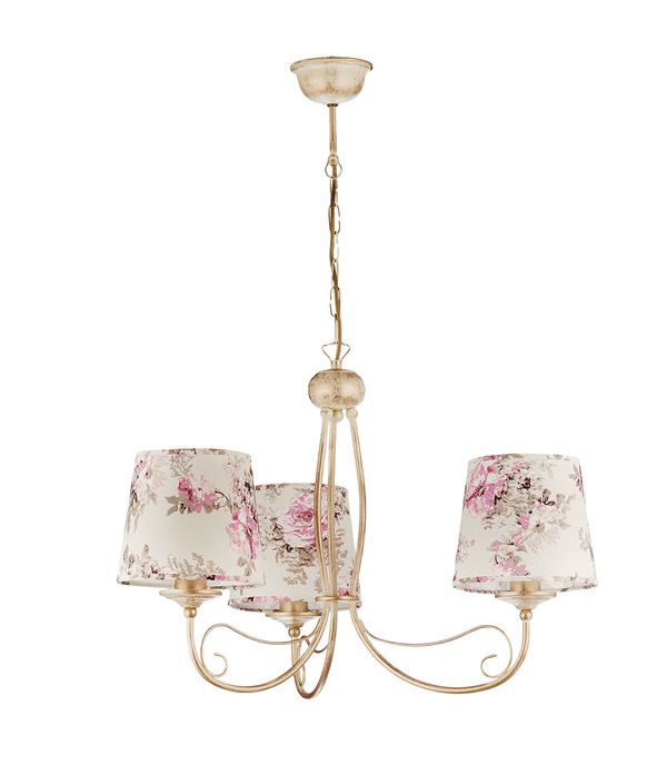Żyrandol trójramienny Sari, z abażurkami w romantyczne kwiatuszki to piękna propozycja do sypialni i salonów. Cała lampa pomalowana jest na kolor kremowo złoty, co mimo swoich dużych rozmiarów dodaje jej delikatności. Żyrandol doskonale będzie pasował do wnętrz urządzonych w stylu prowansalskim i rustykalnym, gdzie dominują elementy i dekoracje w drewnie, ceramice i szkle.