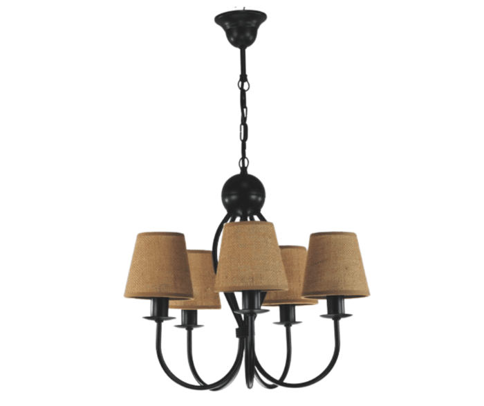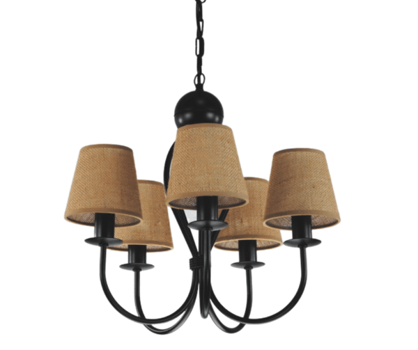 Żyrandol klasyczny Surim pięcioramienny w kolorze czarnym z abażurkami z juty, to bardzo ładna i ponadczasowa propozycja oprawy oświetleniowej. Jego forma i kształt sprawiają, że od lat cieszy się dużym zainteresowaniem kupujących. Proporcjonalne i ładne abażurki równomiernie rozpraszają światło żarówki. Świetnie sprawdzi się jako oświetlenie salonu i pokoju, ale również można go powiesić w jadalni i kuchni. Doskonale wkomponuje się w mieszkania o stylu klasycznym, tradycyjnym i eko. Lampę można samemu skrócić o 3 ogniwka łańcucha, obniżając jej wysokość o 10 cm. Cała lampa wraz z abażurkami powstaje w naszej firmie.