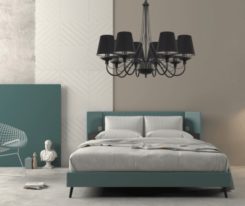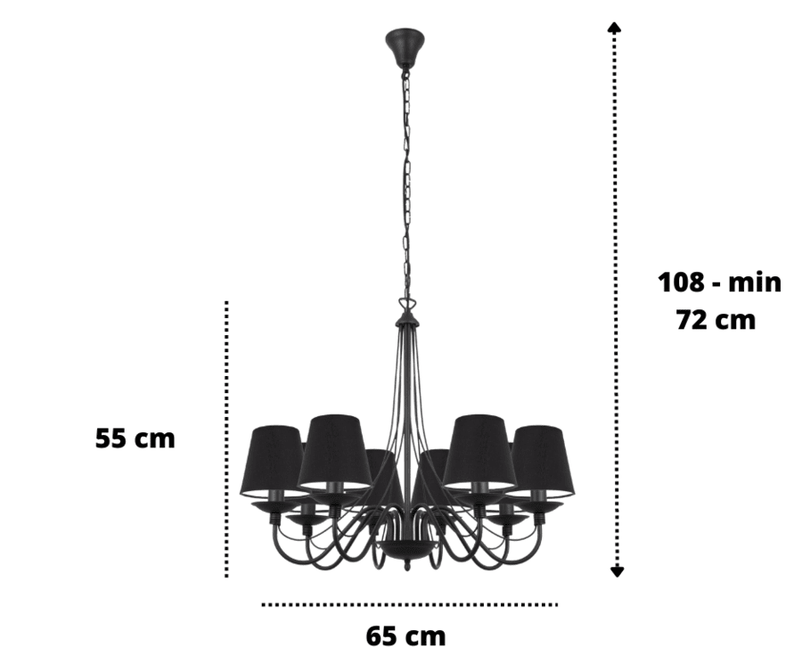 Żyrandol czarny z abażurami w kolorze czarnym, duży Santa, to propozycja dość dużej oprawy oświetleniowej w stylu klasycznym. Lampa posiada osiem ramion delikatnie ozdobionych drucikami i jest pomalowana na kolor czarny. Santa to żyrandol który swoją formą i kolorystyką sprawia, że jest najczęstszym "gościem" w klasycznych i tradycyjnych salonach. Natomiast jego ponadczasowy styl i forma sprawiają że pokoje i salony urządzone w stylu nowoczesnym i modern nie są mu obce. Dla najbardziej odważnych :) polecamy Santę powiesić w pomieszczeniach typu loft, tak aby przełamać stereotypy. W tej czarnej lampie wiszącej żarówki w sposób elegancki i stylowy przykrywają abażury. Dzięki temu światło nie razi nas w oczy, lecz delikatnie i równomiernie rozchodzi się po salonie, pokoju, czy jadalni. Model Santa jest dostępny w szerokiej kolorystyce stelaży i abażurów, a polecamy też zapoznać się z modelami większymi na 12 i 18 żarówek.