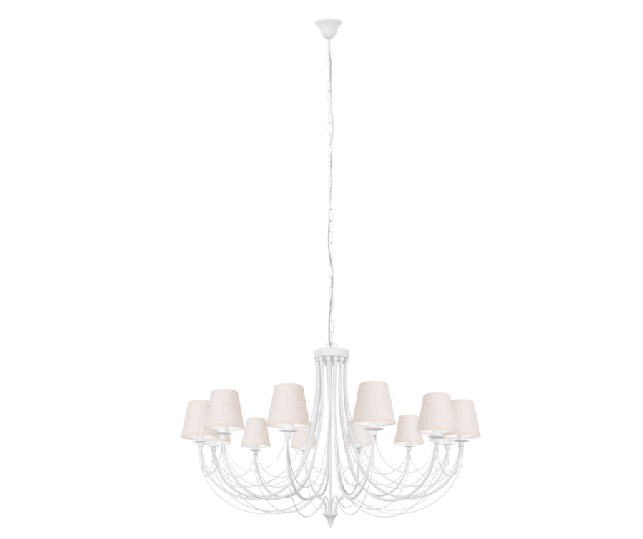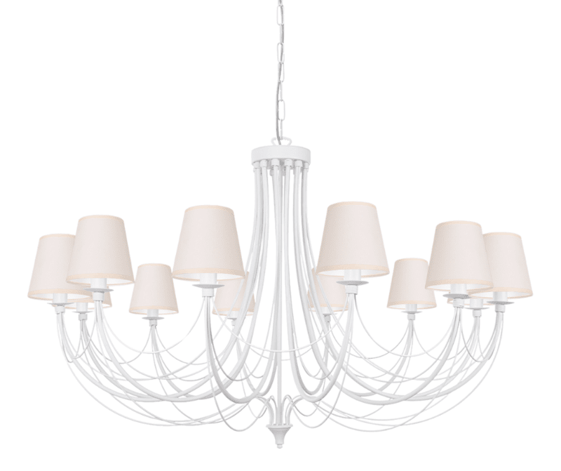 Duża lampa JOVESA w rozmiarze XXL to piękny, biały pałacowy żyrandol z abażurkami o dwunastu ramionach. Średnica lampy to 110 cm. Jest to bardzo okazały biały żyrandol, który doskonale oświetli i ozdobi duży salon, wysoki hol lub eleganckie pomieszczenie hotelowe. Biały duży żyrandol z 12-nastoma punktami światła często jest wybierany jako żyrandol pałacowy do sali balowej lub jako eleganckie oświetlenie klasyczne do sali przyjęć. Żyrandol ma wysokość 170 cm, składa się na nią stelaż - 70 cm oraz łańcuch w standardowej długości 1 m. Jeśli Wasze pomieszczenie jest bardzo wysokie to wystarczy do nas napisać - na zamówienie wydłużymy łańcuch żyrandola o kolejne ogniwa, dzięki czemu lampa zawiśnie na odpowiedniej wysokości. A jeżeli łańcuch jest zbyt długi, to samodzielnie możecie go skrócić odejmując kolejne ogniwa. Minimalna wysokość żyrandola z dwoma ogniwami łańcucha to w sumie 80 cm. Duży żyrandol pałacowy JOVESA zachwyca pięknym kształtem klasycznego stelaża, gięte ramiona dodają białemu świecznikowi lekkości i wyjątkowego charakteru. Jest to bardzo elegancka, a jednocześnie finezyjna w formie duża biała lampa świecznikowa z eleganckimi kremowymi - ecru abażurkami.