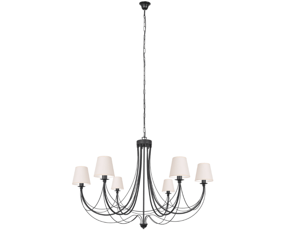 Jovesa to okazała, stylowa lampa z sześcioma ramionami, które zwieńczone są punktami światła w eleganckich, materiałowych abażurkach w odcieniu beżu i ecru.