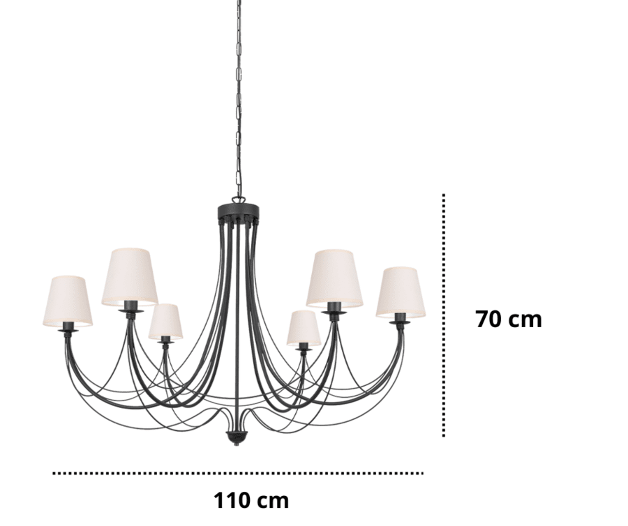Żyrandol z abażurami polecany jest do wysokich i przestronnych sal - będzie głównym punktem reprezentacyjnego salonu, jadalni czy eleganckiego holu. Sposób mocowania lampy pozwala na regulację jej odległości od sufitu - na Państwa życzenie możemy wykonać dłuższy łańcuch. W standardzie ta duża lampa ma 170 cm wysokości i można ją samodzielnie skrócić do około 80 cm odejmując ogniwka łańcucha podczas montażu. Wszystkie zmiany długości łańcucha można umieścić w rubryce " uwagi" podczas zakupu, zgłosić je mailowo lub telefonicznie 536 762 776. Nasze wieloramienne żyrandole świecznikowe oraz te z abażurami są ozdobą wielu stylowych restauracji, hoteli i domowych salonów, a klienci sięgają po kolejne lampy z tej rodziny.