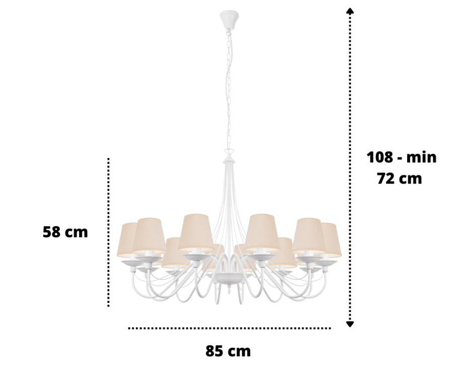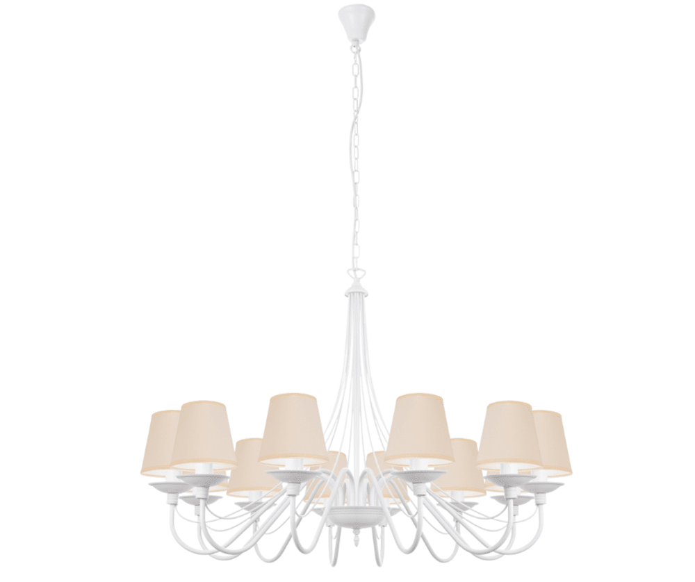Jeżeli chcecie postawić na coś wyjątkowego, to klasyczny, efektowny żyrandol z abażurami w kolorze białego matu będzie idealnym wyborem. Kupując lampę wiszącą, stawiasz na ponadczasowy kształt i formę oświetlenia oraz otrzymujesz gwarancję jakości. Okazały, elegancki i stylowy żyrandol to znakomity pomysł na oświetlenie i ozdobę salonu. Ten duży żyrandol ma proporcjonalne abażury, które dodają lampie delikatności i zasłaniają żarówki, tak aby ich światło nie raziło oczu. Lampa ma 85 cm średnicy, a jej całkowitą długość możemy zmienić, dodając odpowiednią ilość ogniwek łańcucha. Santa jest częstym "gościem" w wysokich salonach, salach i pomieszczeniach hotelowych. Idealnie wkomponuje się w styl tradycyjny, klasyczny, prowansalski i shabby chic. Bardzo często też ze względu na swój ponadczasowy styl oświetla salony nowoczesne.