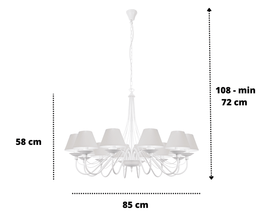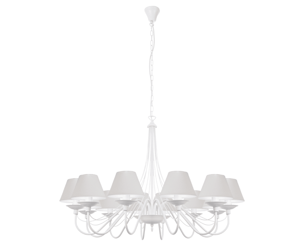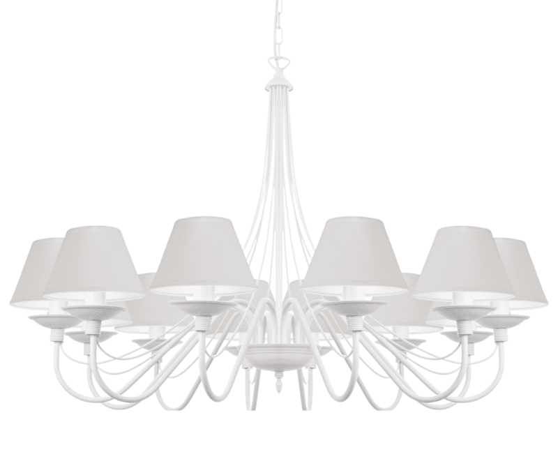 Jeżeli chcecie postawić na coś wyjątkowego, to klasyczny, efektowny żyrandol z abażurami w kolorze białego matu będzie idealnym wyborem. Kupując lampę wiszącą, stawiasz na ponadczasowy kształt i formę oświetlenia oraz otrzymujesz gwarancję jakości. Okazały, elegancki i stylowy żyrandol to znakomity pomysł na oświetlenie i ozdobę salonu. Ten duży żyrandol ma proporcjonalne abażury, które dodają lampie delikatności i zasłaniają żarówki, tak aby ich światło nie raziło oczu. Lampa ma 85 cm średnicy, a jej całkowitą długość możemy zmienić, dodając odpowiednią ilość ogniwek łańcucha. Santa jest częstym "gościem" w wysokich salonach, salach i pomieszczeniach hotelowych. Idealnie wkomponuje się w styl tradycyjny, klasyczny, prowansalski i shabby chic. Bardzo często też ze względu na swój ponadczasowy styl oświetla salony nowoczesne.