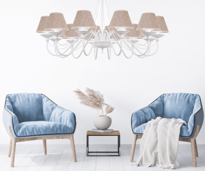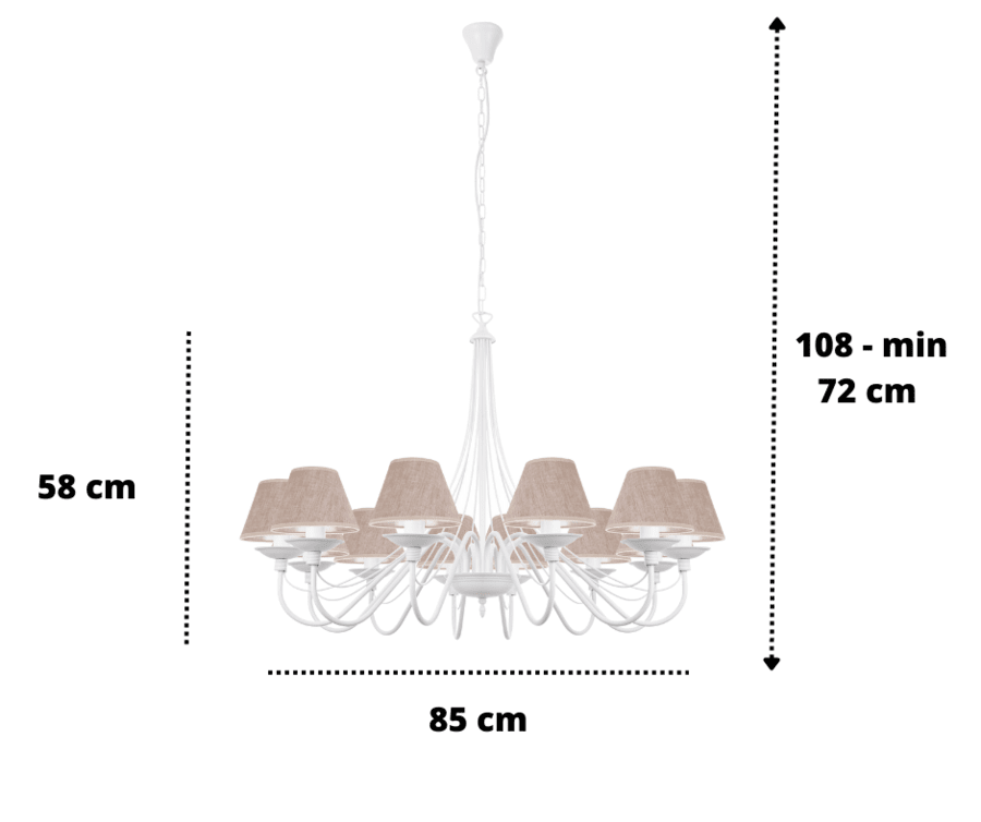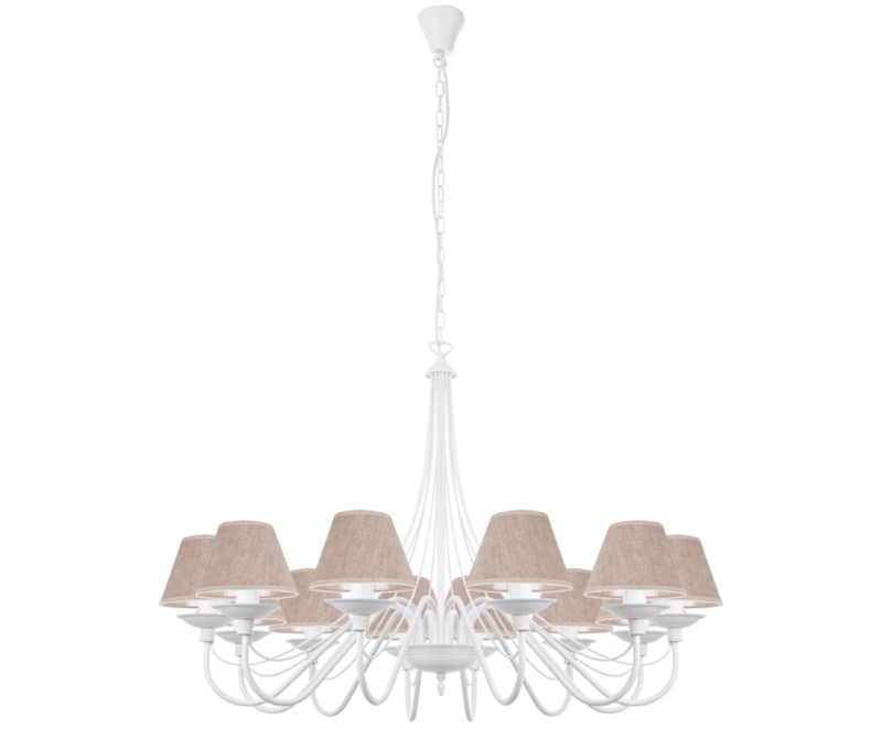Jeżeli chcecie postawić na coś wyjątkowego, to klasyczny, efektowny żyrandol z abażurami w kolorze białego matu będzie idealnym wyborem. Kupując lampę wiszącą, stawiasz na ponadczasowy kształt i formę oświetlenia oraz otrzymujesz gwarancję jakości. Okazały, elegancki i stylowy żyrandol to znakomity pomysł na oświetlenie i ozdobę salonu. Ten duży żyrandol ma proporcjonalne abażury, które dodają lampie delikatności i zasłaniają żarówki, tak aby ich światło nie raziło oczu. Lampa ma 85 cm średnicy, a jej całkowitą długość możemy zmienić, dodając odpowiednią ilość ogniwek łańcucha. Santa jest częstym "gościem" w wysokich salonach, salach i pomieszczeniach hotelowych. Idealnie wkomponuje się w styl tradycyjny, klasyczny, prowansalski i shabby chic. Bardzo często też ze względu na swój ponadczasowy styl oświetla salony nowoczesne.