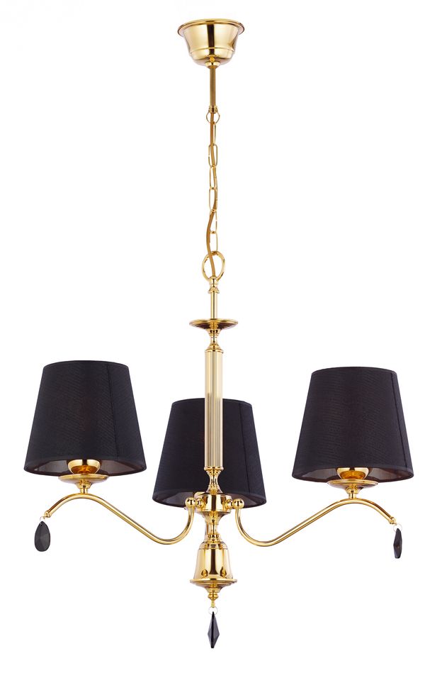 Żyrandol z abażurami Egida to bardzo elegancka propozycja oświetlenia do salonu i dużego pokoju. Lampa ma trzy ramiona ozdobione czarnymi kryształami, oraz posiada abażurki czarne, które pięknie i równomiernie rozpraszają światło. Żyrandol jest wyjątkowej urody, a jego kolorystyka- mosiądz satynowany - będzie pasować do wiele aranżacji, nawet tych w stylu galmour.