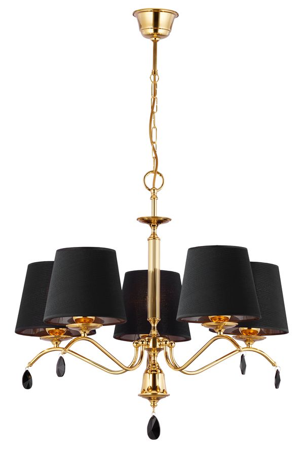Żyrandol z abażurami Egida to bardzo elegancka propozycja oświetlenia do salonu i dużego pokoju. Lampa ma pięć ramion ozdobionych czarnymi kryształami, oraz posiada czarne abażurki, które pięknie i równomiernie rozpraszają światło. Żyrandol jest wyjątkowej urody, a jego kolorystyka- mosiądz satynowany - będzie pasować do wiele aranżacji, nawet tych w stylu galmour.