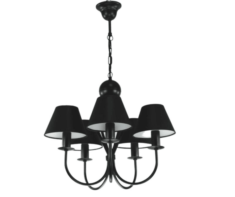 Żyrandol klasyczny Surim pięcioramienny w kolorze czarnym z abażurkami też czarnymi, to bardzo ładna i ponadczasowa propozycja oprawy oświetleniowej. Jego forma i kształt sprawiają, że od lat cieszy się dużym zainteresowaniem kupujących. Proporcjonalne i ładne abażurki równomiernie rozpraszają światło żarówki. Świetnie sprawdzi się jako oświetlenie salonu i pokoju, ale również można go powiesić w jadalni i kuchni. Doskonale wkomponuje się w mieszkania o stylu klasycznym, tradycyjnym i retro. Lampę można samemu skrócić o 3 ogniwka łańcucha, obniżając jej wysokość o 10 cm. Cała lampa wraz z abażurkami powstaje w naszej firmie.