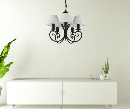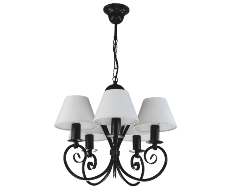 Klasyczny żyrandol pięcioramienny Klinos to nasza Top lampa. O powodzeniu tego modelu żyrandola do salonu decyduje jego ponadczasowy design - klasyczny, zgrabny kształt, który pasuje do wielu stylów wnętrz i nigdy nie wychodzi z mody. Jest to piękna i praktyczna lampa do pokoju. Polecamy ją do niewielkich salonów i pokoi urządzonych w sposób tradycyjny, klasyczny, ale z nutą nowoczesności. Czarny, zwarty stelaż i abażurki w kolorze białym sprawiają, że stylowy żyrandol pasuje do pokoi, kuchni i małych salonów urządzonych w różnych stylach. Lampa dobrze wpisuje się w charakter wnętrz skandynawskich. Biel abażurków dodaje lampie lekkości i wyrazistości. Żyrandol doskonale będzie prezentować się w pokojach, w których dominują dodatki z drewna lub metalowe. Żyrandol można skrócić o ok. 10 cm, odejmując trzy ogniwka łańcucha. Lampę do pokoju można łatwo odmienić dokupując do niej komplet abażurów w innej kolorystyce.