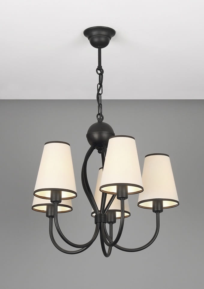 Żyrandol klasyczny Horcynt pięcioramienny w kolorze czarnym, z abażurkami jasnobeżowymi. Jego ponadczasowa forma i kształt sprawiają, że od lat cieszy się dużym zainteresowaniem kupujących. Świetnie sprawdzi się jako oświetlenie salonu i pokoju, ale również można go powiesić w jadalni i kuchni. Doskonale wkomponuje się w mieszkania o stylu klasycznym, tradycyjnym i retro. Cała oprawa oświetleniowa wraz z abażurkami powstaje w naszej firmie.