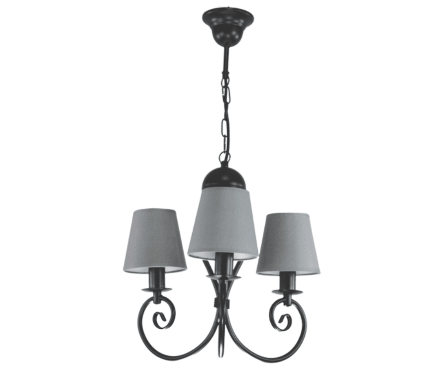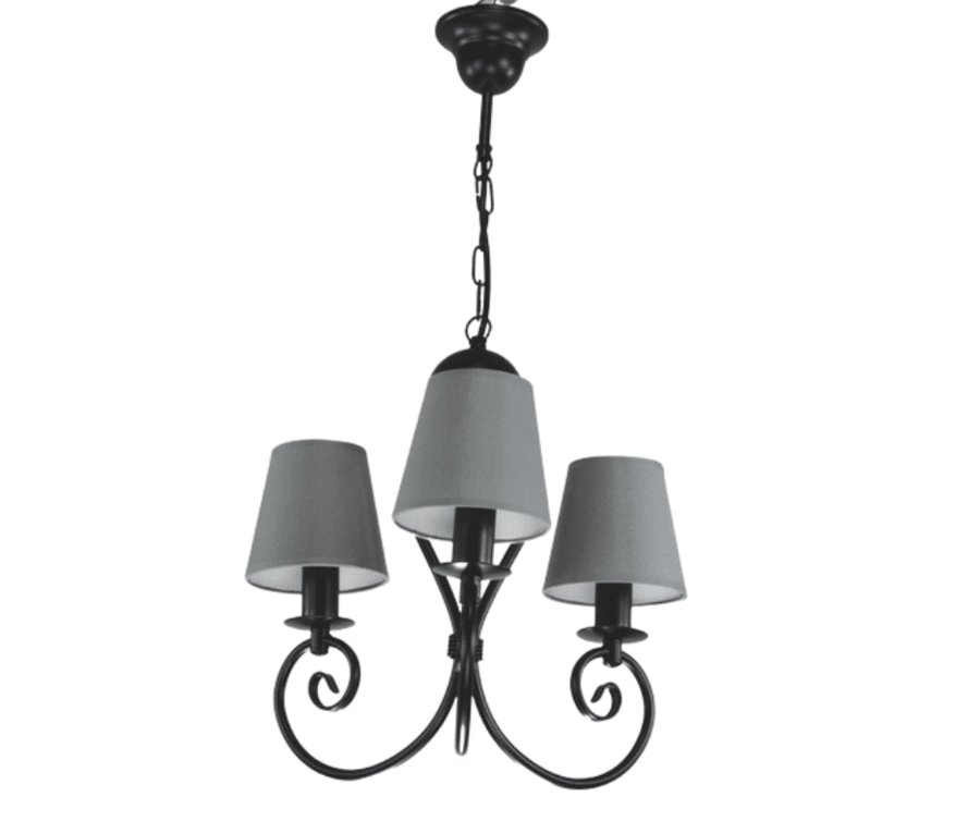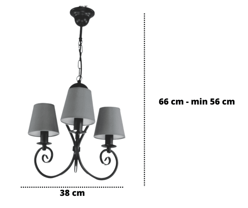 Żyrandol klasyczny z abażurkami Kliwia to lampa wisząca z trzema subtelnie i elegancko wygiętymi ramionami. Konstrukcja żyrandola do pokoju pomalowana jest na kolor czarny matowy. Abażurki stożkowe są wykonane z szarego, eleganckiego materiału, dzięki któremu światło żyrandola nie razi oczu i jest równomiernie rozproszone. Cała oprawa ma 66 cm długości i można ją skrócić o około 10cm, odejmując 3 oczka łańcucha. Czarny Żyrandol klasyczny z serii Kliwia oświetla przede wszystkim małe sypialnie, saloniki i pokoje, w których dominują kolory jasne i odcienie szarości. Do kompletu z czarną lampą z abażurami można dobrać kinkiety klasyczne z abażurami.