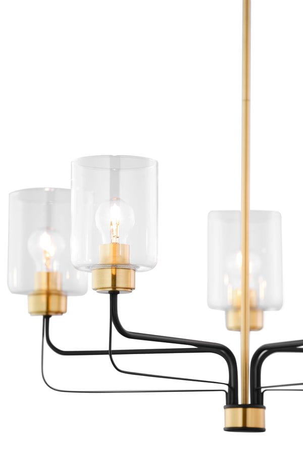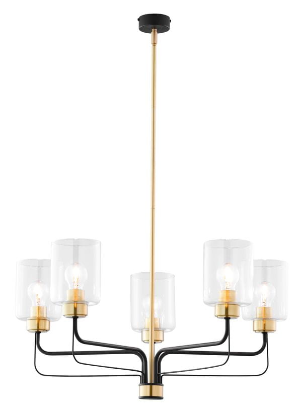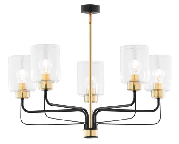 Czarno - złoty i nowoczesny żyrandol Ceres to prosty i oryginalny stelaż. Prezentuje nowoczesny, nieco "kosmiczny" design z pięcioma punktami światła. Ta duża lampa na sufit, ma bezbarwne szklane klosze o średnicy 14 cm. Oryginalna, dynamiczna forma lampy sprawia, że pasuje ona do wielu wnętrz i dodaje im wyjątkowego, futurystycznego charakteru. Salony, pokoje i jadalnie urządzone w stylu loft, industrialnym i nowoczesnym, to miejsce gdzie nasza oprawa będzie się czuła najlepiej.