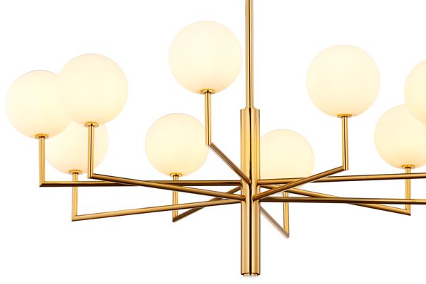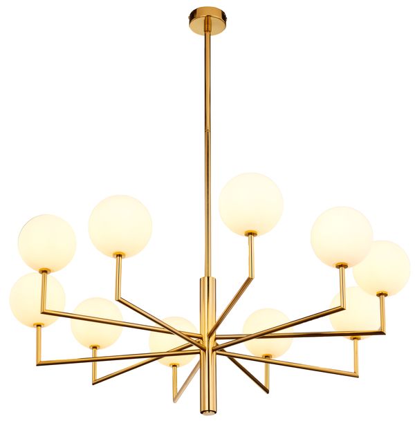 Mosiężny nowoczesny żyrandol Febe to prosty i oryginalny stelaż. Prezentuje nowoczesny, nieco "kosmiczny" design z dziesięcioma punktami światła. Ta duża lampa na sufit, ma mleczne szklane kule o średnicy 12 cm. Oryginalna, dynamiczna forma lampy sprawia, że pasuje ona do wielu wnętrz i dodaje im wyjątkowego, futurystycznego charakteru. Salony, pokoje i jadalnie urządzone w stylu loft, industrialnym i nowoczesnym, to miejsce gdzie nasza oprawa będzie się czuła najlepiej.