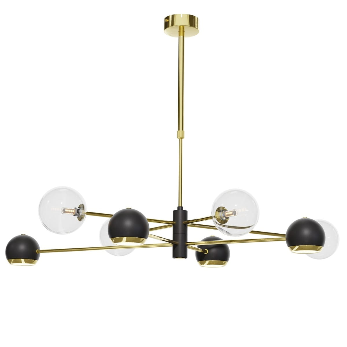 Czarno-złoty nowoczesny żyrandol MAKAO to oryginalny stelaż lampy sufitowej, która łączy oświetlenie punktowe z eleganckimi szklanymi kulami. Jest to lampa 8-punktowa, w której ramiona naprzemiennie zakończone są reflektorkami w czarno-złotych oprawach i lekkimi bezbarwnymi kulami ze szkła. Kule dodają złotej lampie subtelnego charakteru i pięknie rozpraszają świtało żarówek. Czarno-złota lampa sufitowa MAKAO to bardzo eleganckie i praktyczne oświetlenie do niewysokiego salonu. Pionowy stelaż żyrandola jest wyposażony w rodzaj teleskopu, dzięki któremu można lampę samodzielnie wydłużyć lub skrócić do potrzebnej wysokości. Czarno-złoty żyrandol sufitowy ze szklanymi kulami i reflektorkami jest dostępny także w innej wersji kolorystycznej, jako lampa złota, a także w wersji żyrandola sufitowego z 6 ramionami.