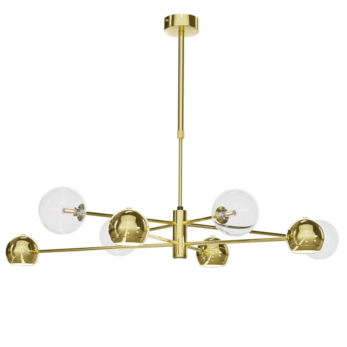Złoty nowoczesny żyrandol MAKAO to oryginalny stelaż lampy sufitowej, która łączy oświetlenie punktowe z eleganckimi szklanymi kulami. Jest to lampa 8-punktowa, w której ramiona naprzemiennie zakończone są reflektorkami w złotych oprawach i lekkimi bezbarwnymi kulami ze szkła. Kule dodają złotej lampie subtelnego charakteru i pięknie rozpraszają świtało żarówek. Złota lampa sufitowa MAKAO to bardzo eleganckie i praktyczne oświetlenie do niewysokiego salonu. Pionowy stelaż żyrandola jest wyposażony w rodzaj teleskopu, dzięki któremu można lampę samodzielnie wydłużyć lub skrócić do potrzebnej wysokości. Złoty żyrandol sufitowy ze szklanymi kulami i reflektorkami jest dostępny także w innej wersji kolorystycznej, jako lampa czarno-złota, a także w wersji żyrandola sufitowego z 6 ramionami.