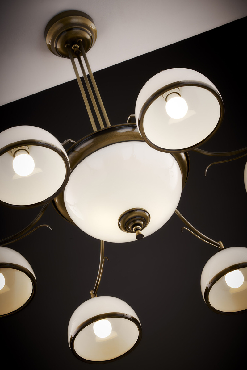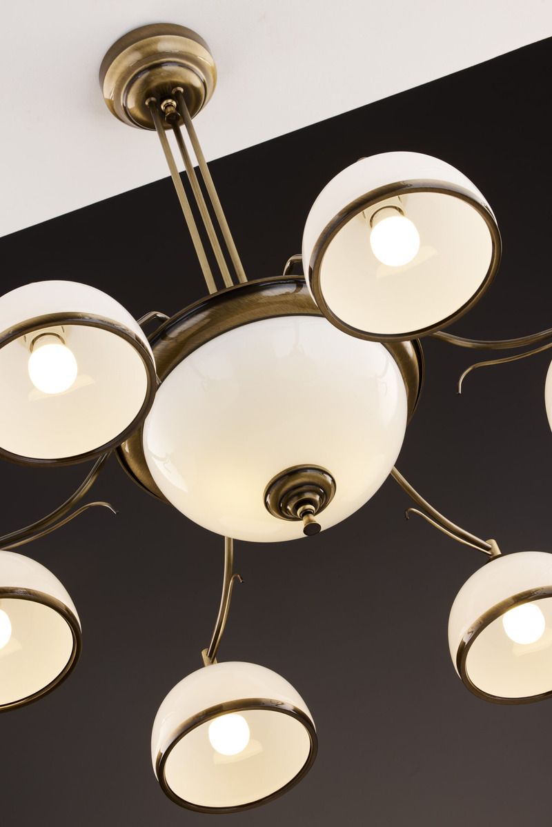 Klasyczny żyrandol w kolorze patyny Malachit to lampa zachwycająca swoim kształtem i stylem. Jest to sześcioramienny, rozłożysty żyrandol z ośmioma punktami światła, gdzie dwa z nich znajdują się w szklanym białym kloszu. Połączenie stelaża w kolorze patyny i eleganckiego białego klosza nadaje lampie wyjątkowego charakteru. Malachit doskonale wpisze się w wystrój klasycznych, eleganckich wnętrz jak i tych urządzonych w stylu rustykalnym.