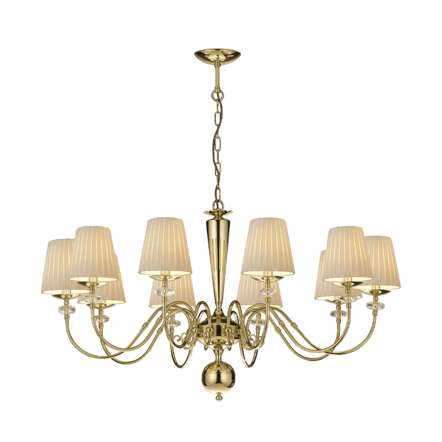 Żyrandol mosiężny Lalasa to bardzo elegancka propozycja oświetlenia do salonu i rezydencji. Lampa ma dziesięć ramion każde dodatkowo ozdobione kryształkiem i plisowanym abażurem, które pięknie i równomiernie rozpraszają światło. Żyrandol jest wyjątkowej urody, a jego kolorystyka - mosiądz - będzie pasować do wiele aranżacji, głównie tych w stylu galmour i dworskim. Lampa premium.