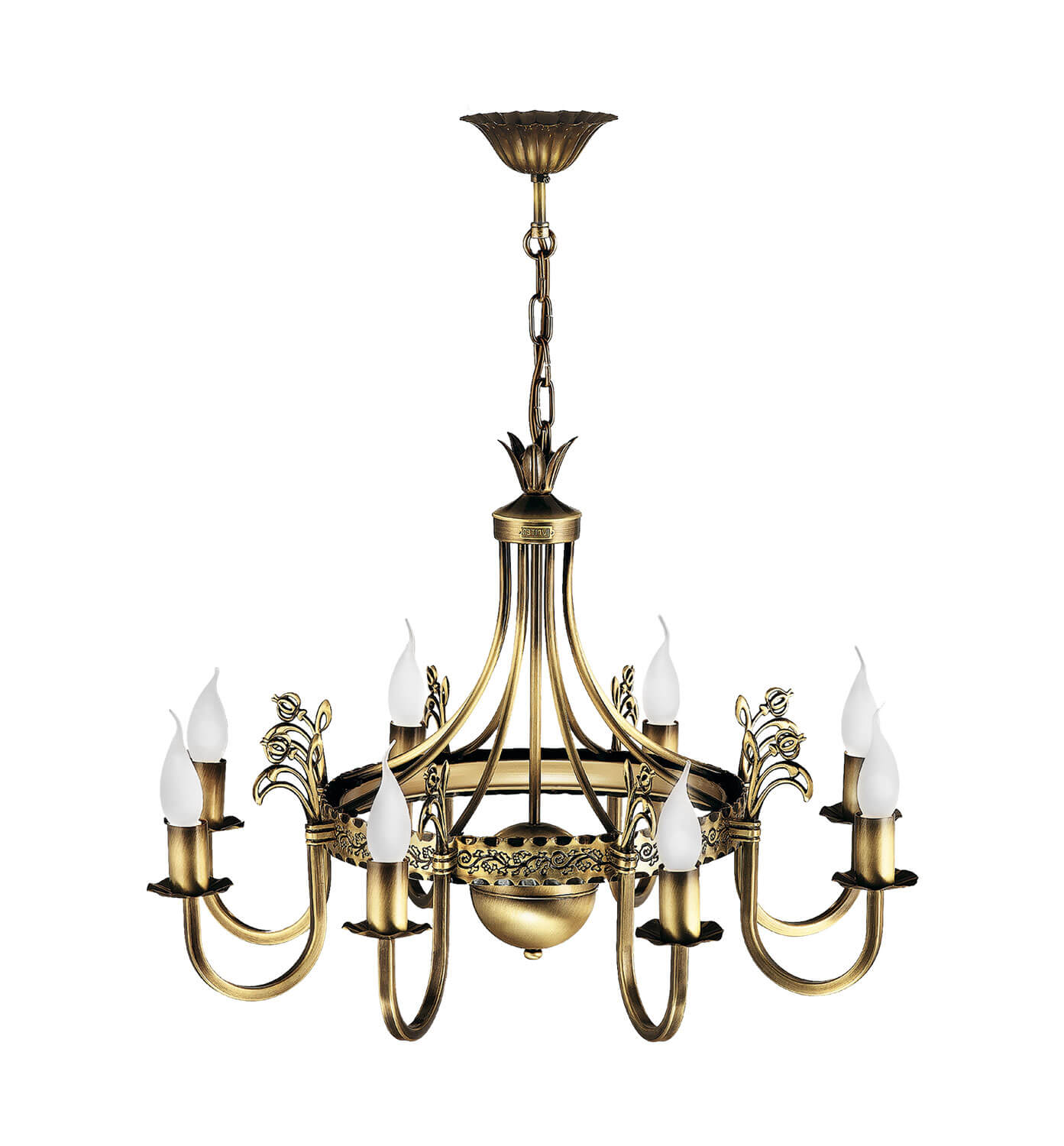 Żyrandol świecznikowy Korn, to propozycja dość dużej oprawy oświetleniowej w stylu klasycznym. Lampa posiada osiem ramion delikatnie ozdobionych metaloplastyką i jest w kolorze starego złota. Korn to żyrandol który swoją formą i kolorystyką sprawia, że jest najczęstszym "gościem" w klasycznych i tradycyjnych salonach.