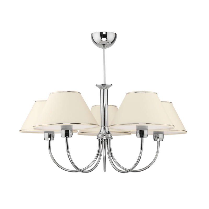 Żyrandol z abażurami Bergamo, to typowa, elegancka klasyka oświetlenia. Bardzo ładny stelaż lamp jest chromowany, a duże jasnobeżowe abażurki równomiernie rozpraszają światło żarówek. Bergamo najczęściej oświetla salony i pokoje urządzone w stylu klasycznym i tradycyjnym, oraz pokoje hotelowe.