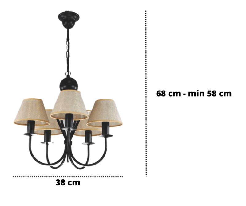 Żyrandol klasyczny Surim pięcioramienny w kolorze czarnym z abażurkami w kolorze naturalnego lnu ze złotą nitką, to bardzo ładna i ponadczasowa propozycja oprawy oświetleniowej. Jego forma i kształt sprawiają, że od lat cieszy się dużym zainteresowaniem kupujących. Proporcjonalne i ładne abażurki równomiernie rozpraszają światło żarówki. Świetnie sprawdzi się jako oświetlenie salonu i pokoju, ale również można go powiesić w jadalni i kuchni. Doskonale wkomponuje się w mieszkania o stylu klasycznym, tradycyjnym i retro. Lampę można samemu skrócić o 3 ogniwka łańcucha, obniżając jej wysokość o 10 cm. Cała lampa wraz z abażurkami powstaje w naszej firmie.