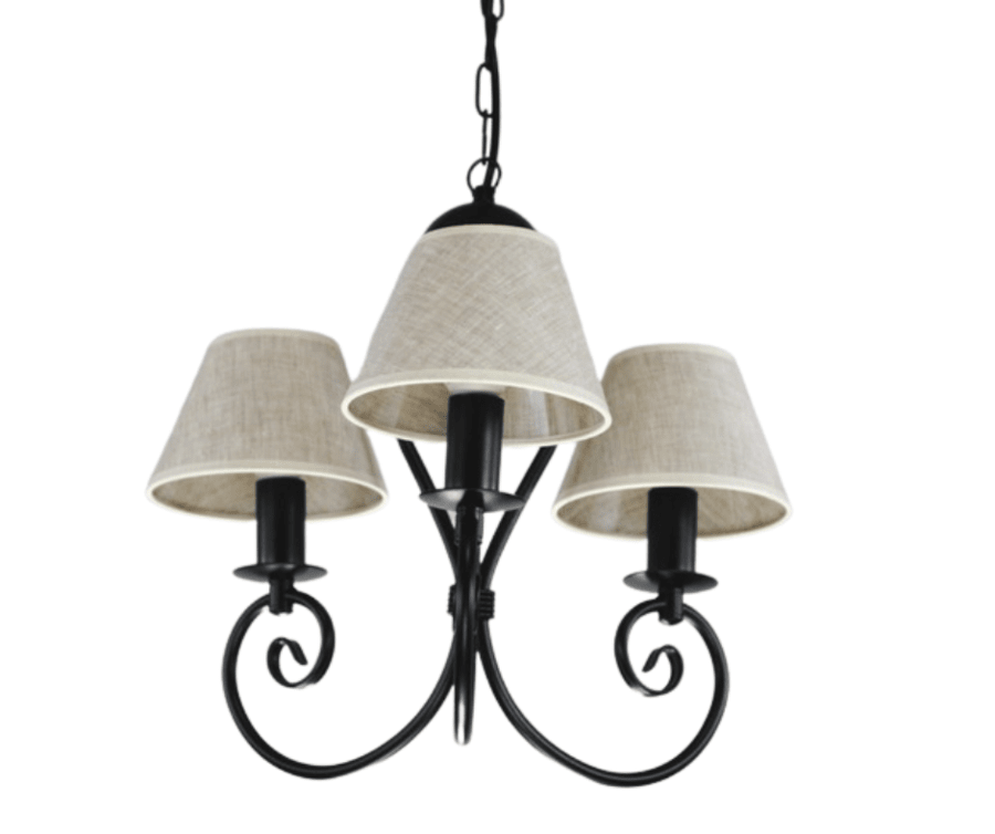 Żyrandol trójramienny Klinos to nasza TOP lampa. Czarny żyrandol z jasnymi abażurami to klasyka oświetlenia w domu. Ponadczasowy kształt lampy wiszącej nawiązuje do dawnych form żyrandoli, jednak jest to lampa do pokoju w nowoczesnym i modnym wydaniu. Żyrandol z abażurami Klinos polecamy do niewielkich salonów i pokoi urządzonych w sposób tradycyjny, klasyczny. Czarny żyrandol klasyczny jest również doskonałą ozdobą pomieszczeń nowoczesnych. Czarny stelaż lampy i kontrastujące z nim abażurki w kolorze lnu sprawiają, że lampa wisząca pasuje do pokoi, kuchni i małych salonów urządzonych w stylu naturalnym i eco. Lampa z abażurami doskonale będzie się prezentować w pokojach, gdzie dominują dodatki z drewna. Oprawę oświetleniową można samodzielnie skrócić o ok. 10 cm, odejmując trzy ogniwka łańcucha.