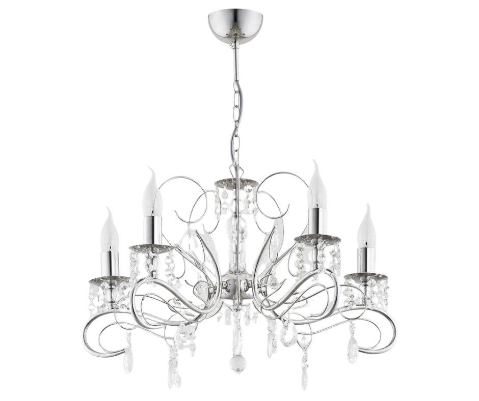 Lampa świecznikowa z kryształkami z rodziny Astoria. Żyrandol posiada pięć ramion, które ozdabiają pięknie wygięte druty i mieniące się w świetle żarówek kryształki. Żyrandol jest w kolorze srebrnym - chromowym i będzie doskonale pasował do salonów i pokoi urządzonych w stylu nowoczesnym, klasycznym i glamour .