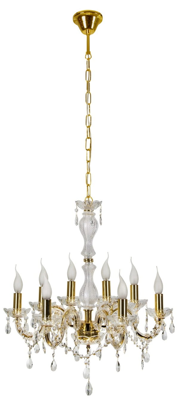 Złoty, ozdobny, ośmioramienny żyrandol świecznikowy z kryształkami Bonna. Doskonały pomysł do naszych sypialni i salonów urządzonych w stylu klasycznym i glamour. Żyrandol o ponadczasowej formie i wyglądzie. Wszystkie piękne i mieniące się w świetle ozdoby są wykonane ze szkła. Dodatkowo złote ramiona lampy powlekają akrylowe odlewy, które nadają lampie specyficznego bogatego i szykownego charakteru. Żyrandol ma długość 130 cm - ale można go samodzielnie skrócić o poszczególne ogniwka łańcucha. Gdyby jednak nastąpiła potrzeba wydłużenia zawiesia, prosimy nas poinformować telefonicznie, lub mailowo o tej zmianie którą wykonamy bezpłatnie.