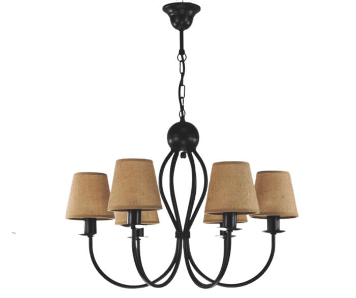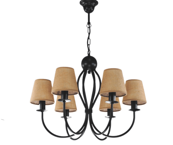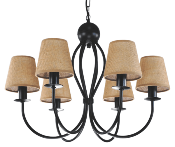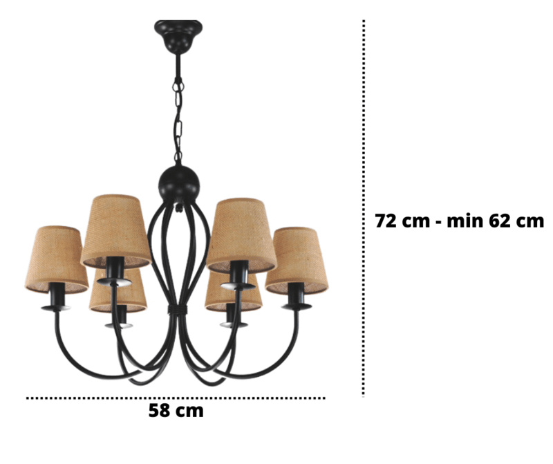 Żyrandol Surim sześcioramienny, czarny z abażurkami w kolorze naturalnym - juta, to nasza TOP lampa. Uniwersalny kształt, ponadczasowa forma i wygląd, oraz proporcjonalne wymiary sprawiają, że cieszy się on od lat bardzo dużym zainteresowaniem klientów. Lampa wybierana jest do klasycznych salonów, do pokoi urządzonych w tradycyjny sposób, albo do jadalni nad stół, gdzie jest piękną i funkcjonalną ozdobą. Abażurki pięknie i równomiernie rozpraszają światło żarówek. Lampę można samodzielnie skrócić o ok. 10 cm odejmując 3 ogniwka łańcucha, lub na specjalne zamówienie wydłużyć. Żyrandol w modnym stylu naturalnym - eco.