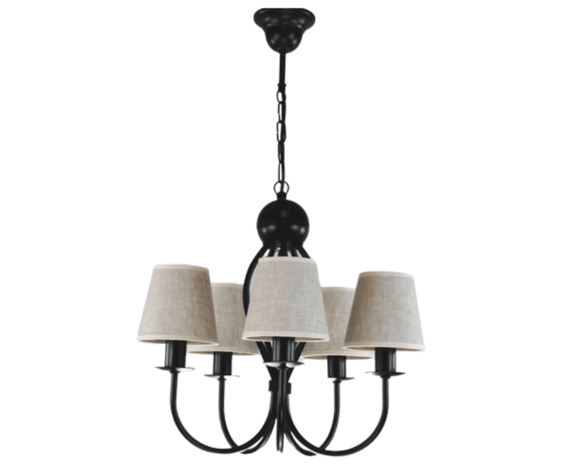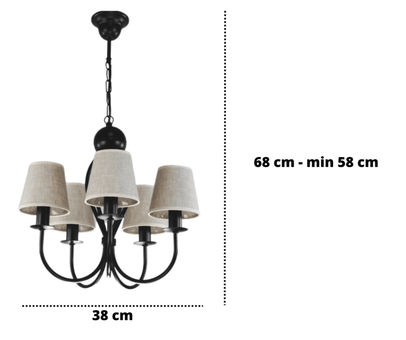 Żyrandol klasyczny Surim pięcioramienny w kolorze czarnym z abażurkami w kolorze naturalnego lnu, to bardzo ładna i ponadczasowa propozycja oprawy oświetleniowej. Jego forma i kształt sprawiają, że od lat cieszy się dużym zainteresowaniem kupujących. Proporcjonalne i ładne abażurki równomiernie rozpraszają światło żarówki. Świetnie sprawdzi się jako oświetlenie salonu i pokoju, ale również można go powiesić w jadalni i kuchni. Doskonale wkomponuje się w mieszkania o stylu klasycznym, tradycyjnym i retro. Lampę można samemu skrócić o 3 ogniwka łańcucha, obniżając jej wysokość o 10 cm. Cała lampa wraz z abażurkami powstaje w naszej firmie.