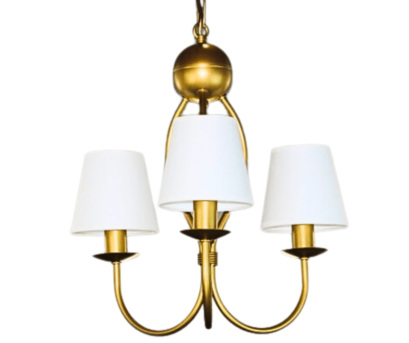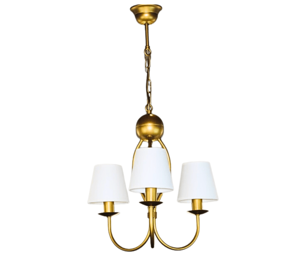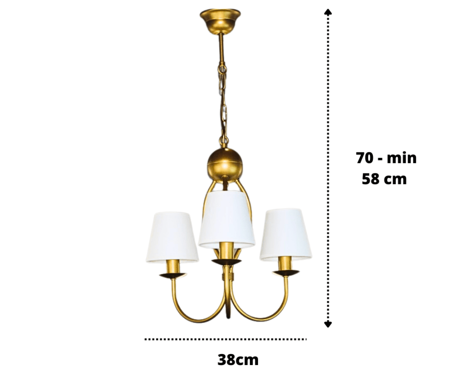 Złoty żyrandol z białymi abażurami Surim, to idealne połączenie kolorystyczne do pokoju, sypialni i jadalni. Pięknie wygięte trzy ramiona żyrandola zakończone są trzema źródłami światła. Lampa zachwyca prostotą i dobrym stylem, jej kształt przywodzi na myśl tradycyjne oświetlenie dawnych salonów, ale z powodzeniem wpisuje się ona w wystrój wnętrz nowoczesnych i dodaje im niepowtarzalnego, eklektycznego charakteru. Białe subtelne abażury równomiernie rozpraszają światło żarówki. Złoty żyrandol z białymi klosikami to dobre rozwiązanie do oświetlenia pomieszczeń urządzonych w stylu klasycznym.