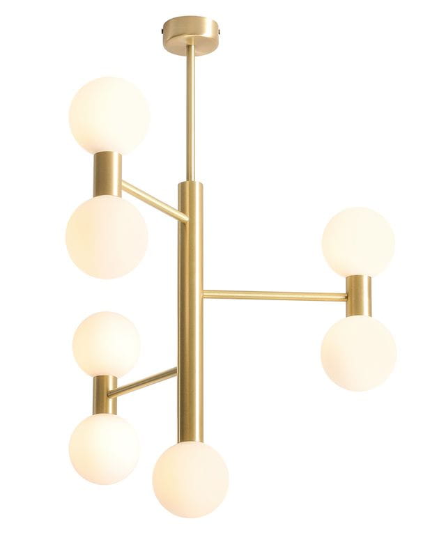 Okazały żyrandol mosiężny Laro z 7 szklanymi kulami osłaniającymi punkty światła. To piękna szklana lampa wisząca, która doskonale sprawdzi się jako ekskluzywne oświetlenie szklane do dużego salonu i do nowoczesnej i eleganckiej jadalni lub jako duża lampa szklana do reprezentacyjnej sali. Laro to złoto-biały żyrandol o nowatorskim designe. Ramiona mosiężnej lampy są ułożone na wzór gałęzi rozłożystego drzewa. Każde z ramion żyrandola to dwa punkty światła osłonięte piękną szklaną kulą - mlecznobiałym kloszem, który miękko rozproszy światło. Dzięki rozmieszczeniu żarówek góra - dół żyrandol szklany emituje światło w wielu kierunkach, co gwarantuje doskonały efekt oświetleniowy i dekoracyjny. Zastosowanie w żyrandolu mosiężnym szklanych kloszy jest rozwiązaniem nowatorskim i bardzo funkcjonalnym. Złota lampa z białymi kulami ma nowoczesny i świeży wygląd i jest bardzo łatwa w czyszczeniu.